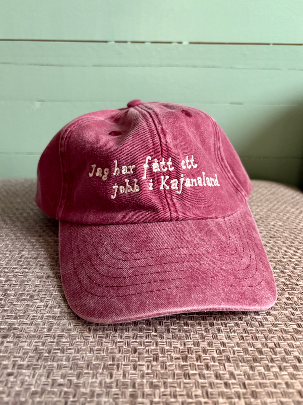 Broderad keps, ”Jag har fått ett jobb i Kajanaland”. Modell: Beechfield Low Profile Vintage Cap. Låg profil, ostrukturerad front, 6 paneler, justerbar med metallspänne och ögla. Färg: röd med guldbrodyr. Design: Bedow.